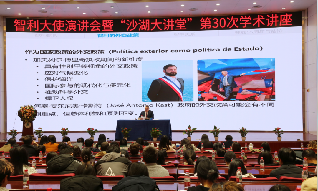 随后,阿里亚兰大使为师生带来了《智利对外政策及中智双边关系》的专题讲座。他表示,能来到拥有悠久拉美研究历史底蕴的湖北大学,对他而言是一份意义非凡的荣誉。大使以“智利对外政策及中智双边关系”为题展开深入讲解,并从地理、历史、政治、经济、文化等多个角度介绍了智利的国家概况。智利地形独特,南北绵延4300公里,坐落于安第斯山脉与太平洋之间,是世界上最长的国家之一。作为南美洲最开放的经济体之一,智利拥有覆盖全球的自由贸易协定网络,经济竞争力和社会发展水平位居拉美前列。