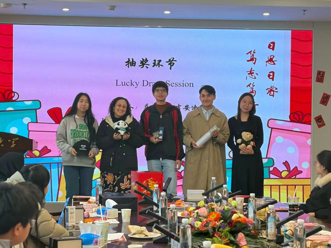 在新年联谊会环节,来自世界多国的留学生和中国学生一起进行了“击鼓传花”“传声筒”“你划我猜”等跨文化游戏,点燃全场热情。青年学子们在协作与欢笑中跨越语言藩篱,缔结真挚情谊。幸运抽奖环节增添了节日喜庆氛围,现场洋溢着温馨与欢乐。最后,全体师生合唱《Have a Happy New Year》,以歌声传递友谊与祝福,共同迎接充满希望的2026年。